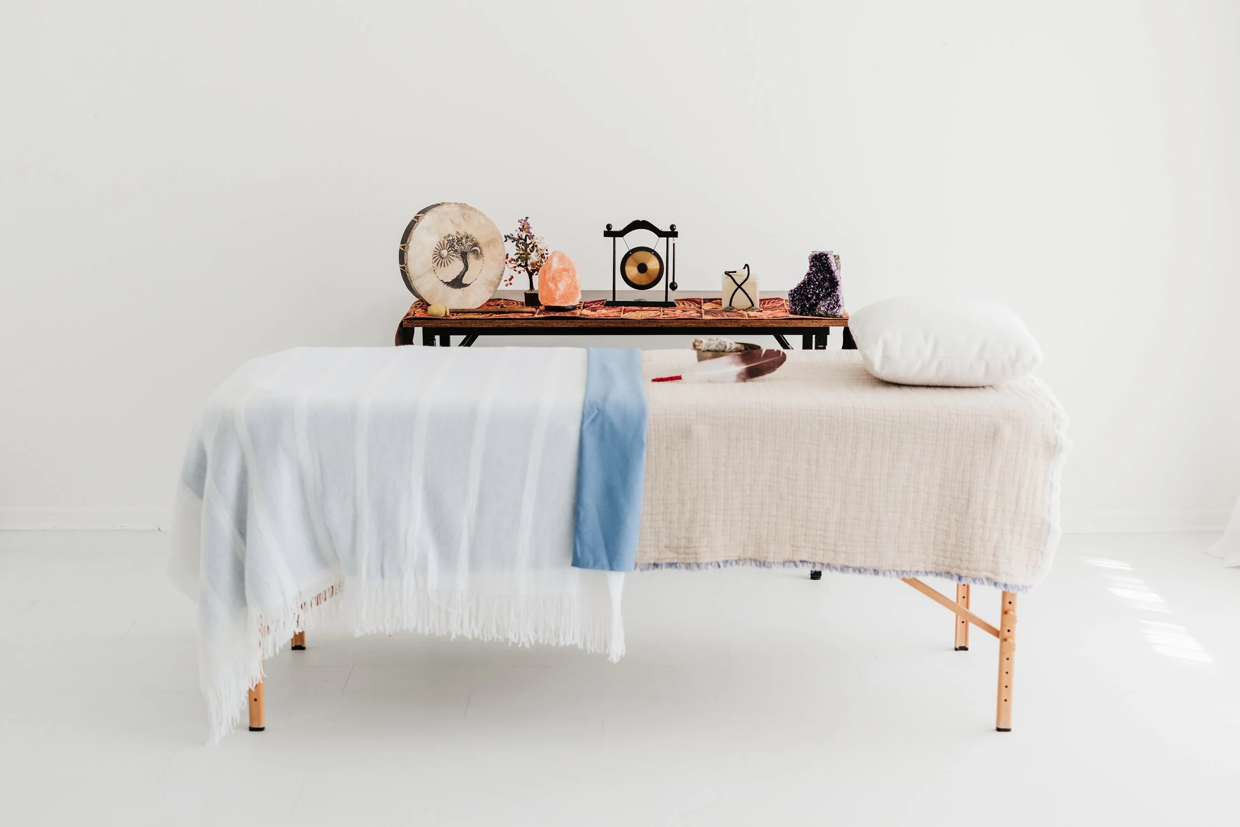 • Massage table with plush tan and blue blankets, prepared for a reiki session. Back table with zen artifacts including, small gong, salt lamp, amethyst stone, and bonsai tree